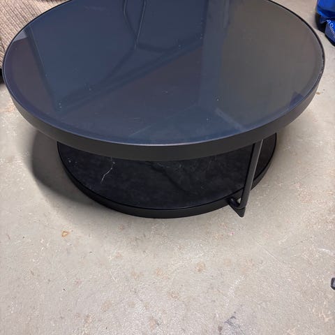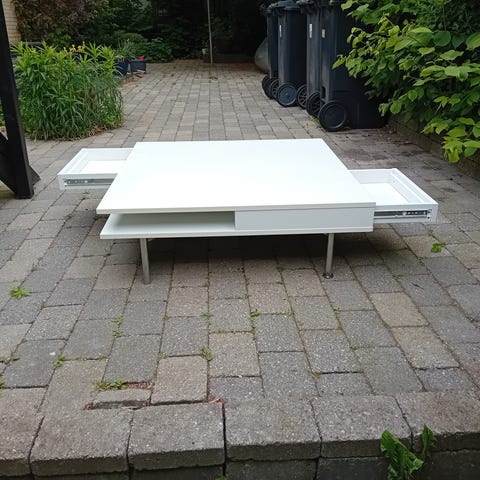 Sofabord, m. stålstativ, 89x89x43, lille hak i det ene hjørne.
