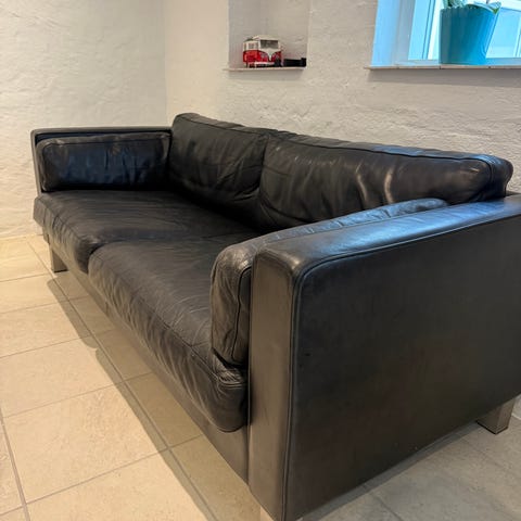 Sofaen fremstår i pæn stand med almindelige brugsspor i læderet (patina), som kun gør den flottere.