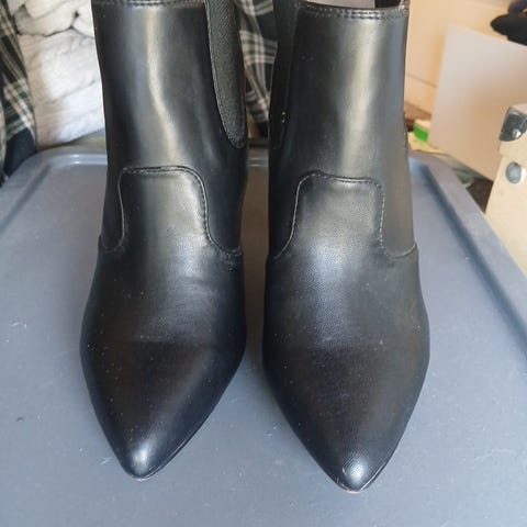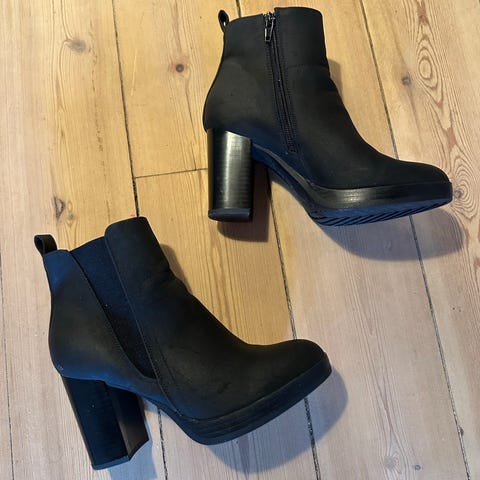 Støvlen er lavet af imiteret læder og har en let foring. Dette er en størrelse 38, og hælen er 8 cm høj med et plateau på 2 cm.