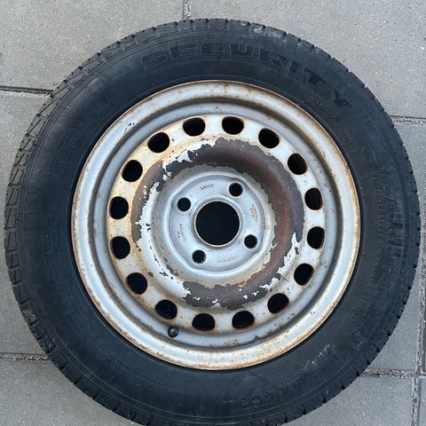 Alufælge med monterede dæk i sølvfarve. Fælgene har 4 bolthuller. ( 4 x 100 mm ) Dækkene har mønster, som fremgår af billederne.
