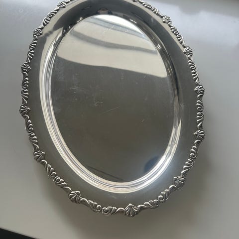 Smuk sølvfad med fine dekorationer rundt i kanten.