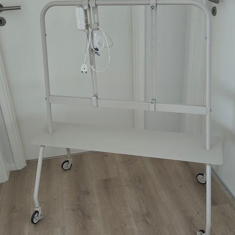 TV stand af mærket Nedis. Kan tilpasses til mange tv. En del skruer er afstandsstykker følger med. Se detaljer her https://nedis.dk/da-dk/product/tv-satellit/mobel-beslag/tv-beslag/550670527/fast-tv-stand-32-65-op-til-45-kg-justerbare-forudfastsatte-hojder-haerdet-glas-stal-sort#support