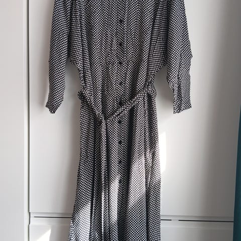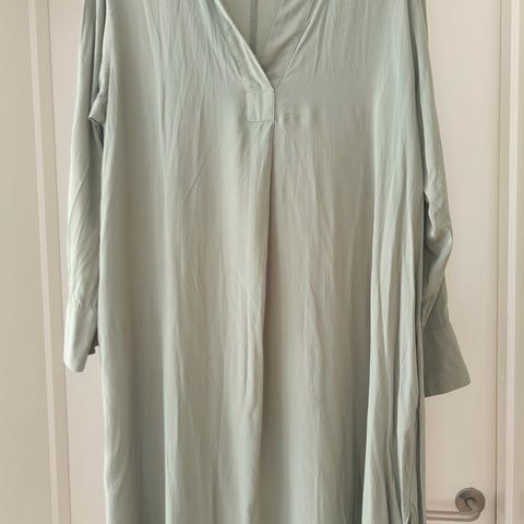 H&M hverdagskjole i grøn viskose, i størrelse XXL. Kjolen har lange ærmer, krave og v-udskæring foran. Der er brystlommedetaljer og bindebånd i taljen , som kan justeres for bedre pasform. Materialet er let og falder blødt, velegnet som hverdagskjole. Fra ikke-ryger hjem. Muligt at få tilsendt pakken med GLS, hvis køber betaler fragten.