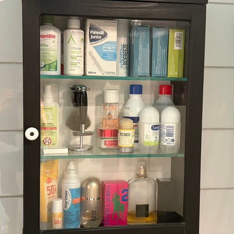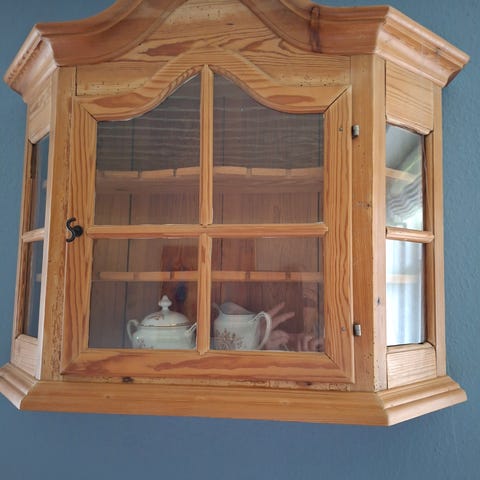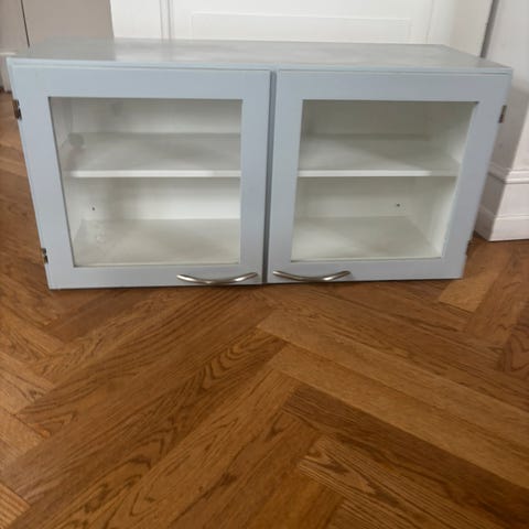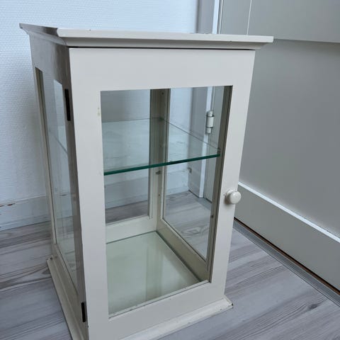 Sødeste lille vitrineskab malet i cremehvid og rosa indeni.