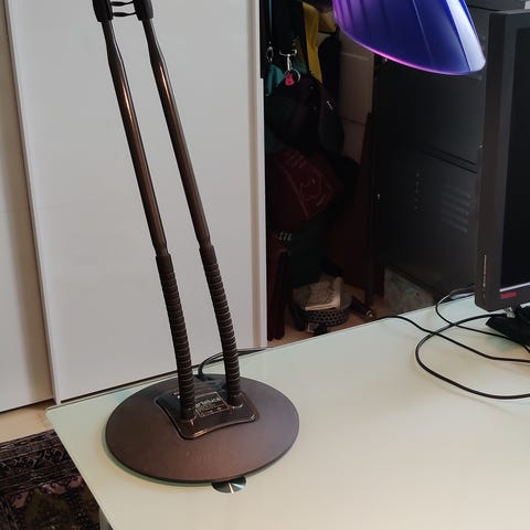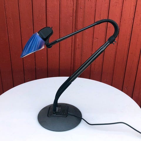 Lakeret stål og kunststof, bøjelig stamme og skærm af blå plast. Fremstår med lidt brugsspor på armen