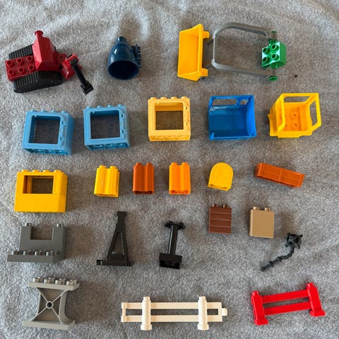 LEGO Fabuland figurer og dele. Samling af flere Fabuland dyrefigurer samt lidt andre af de gamle Lego figurer. Et par køretøjer, træer og diverse smådele som døre, vindue, hegn og andre tilbehørsdele.