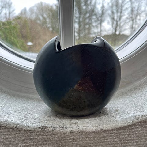 Meget smuk vase i kugleform med smal åbning foroven. Vasen måler ca 17 cm både i diameter og højde.