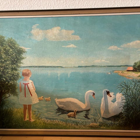 Dette maleri er malet af Ejnar Ivan Bruus maleriet er fra 1972. Ejnar var min mormors morbror og har malet 2 malerier specielt til min mormor’s mor efter hendes ønsker. Ejnar kom fra Svendborg og hans kunstnersignatur står hos Det Kgl. bibliotek når jeg googler ham. Ejnar Ivan Bruus var en dansk maler og forfatter. Maleriet har hele tiden været i familien.