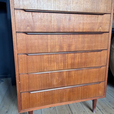 Pæn kommode af teaktræ, seks skuffer. Hvor de to øverste skuffer er lidt smaller. Og den øverste skuffe kan låses og nøglen er der.