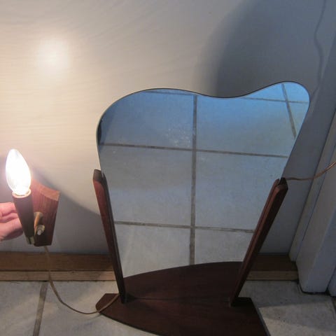 Lækkert teak spejl med hylde. Lidt patina, men i meget fint stand. H:67, B:34.5, D: 12 (ved hyldens bredeste punkt). Sender ikke.