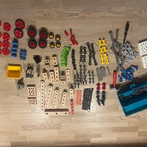 Sættet indeholder blandt andet trælameller med huller, plastklodser med huller, skruer, møtrikker, hjul, tandhjul, kroge, plastværktøj som hammer og skruenøgler samt andre små dele til samling.