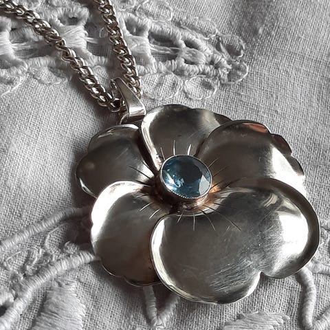 Ældre Georg Jensen halskæde i sølv med vedhæng udformet som en blomst og indfattet halvædelsten i midten. Smykket er stemplet 925 S og modelnummer 436 på bagsiden af vedhænget. Halskæden er designet til kvinder og fremstår i klassisk sølv med lys halvædelsten, egnet til daglig brug eller mere formelle anledninger. Kan sendes med dao for 45kr