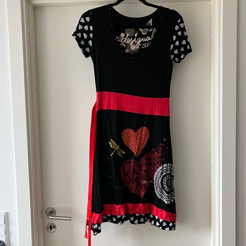 Desigual hverdagskjole til kvinder i str. M. Kjolen er fremstillet i bomuld og har et multifarvet mønster med sorte, hvide og farverige detaljer. Kortærmet model med rund hals og knælang længde. Velegnet som hverdagskjole.