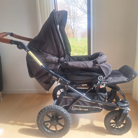 Emmaljunga sammenklappelig klapvogn i koksgrå. Vognen har justerbart ryglæn, fempunktssele og aftagelig frontbøjle. Den er udstyret med fire hjul, hvor de forreste er drejelige, samt en varekurv under sædet. Håndtaget er sammenhængende og kan justeres i vinklen. Kalechen kan slås op for at give læ og skygge. Velegnet som hverdagsklapvogn til ét barn. Vognen er i meget fin stand og ikke falmet, som det ser ud på billederne.
