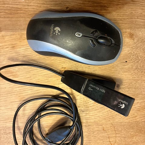 Logitech Cordless Mouse mus med USB-modtager i grå farve. Sættet består af en trådløs optisk mus og en kablet USB-modtager, som tilsluttes computeren via USB-stik. Musen har to hovedknapper og scrollhjul. Egnet til brug med stationære og bærbare computere, der har USB-port og understøtter Logitech Cordless-serien.