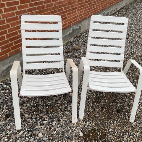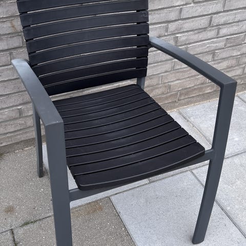 Havestol i sort med stel i aluminium. Stolen har lameller i sæde og ryg samt armlæn. Den er stabelbar og egner sig til udendørs brug på terrasse, altan eller i have. Designet er let og funktionelt med fokus på vejrbestandige materialer, der er nemme at vedligeholde. Der sælges i alt 6 stk. samlet for 300 kr.