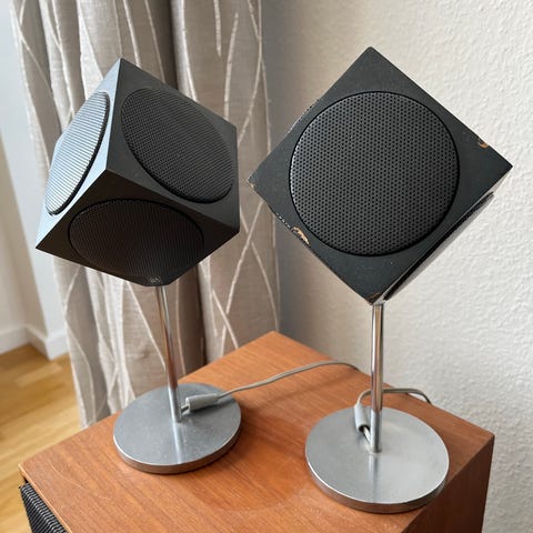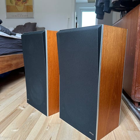 Bang & Olufsen højtalere med kabinet i trælook og frontstof i mørk farve. Sættet består af to fritstående højtalere, der kan anvendes som del af et stereoanlæg eller til anden lydafspilning i hjemmet. Tilsluttes med ledninger, som ses på billedet. Velegnet til placering på gulv eller lavt møbel afhængigt af opsætning og behov.