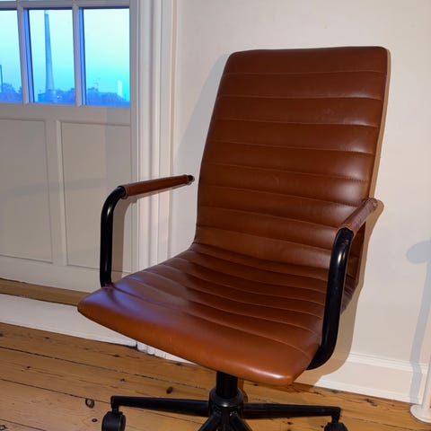 Jeg udbyder hermed min eksklusive kontorstol til salg, idet behovet for hjemmekontor er reduceret, og værelset nu anvendes som gæsteværelse, hvorfor stolen primært adskiller sig i vores stue.