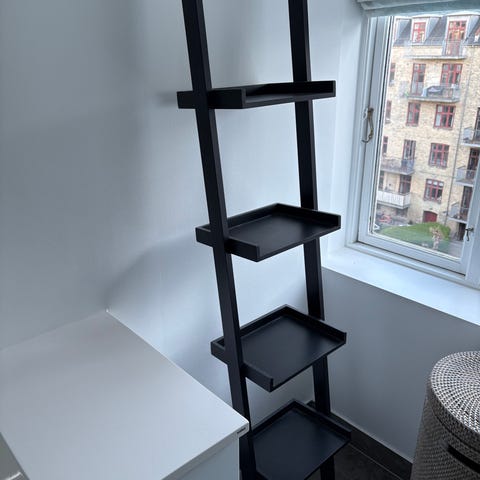 Fin lille reol eller hylde i sort metal, formet som et hus. Har 4 hylder og 2 faste “øjer” til at ophænge i. Er af ældre dato og har brugsspor på metallet. Har selv købt den på DBA, men den passer desværre ikke til badeværelset, hvor den skulle spraymales og ophænges, så håber andre kan få glæde af den :)