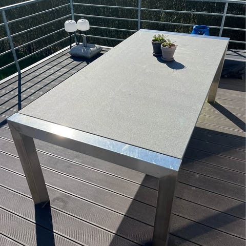 Outrium Alaska granitbord havebord i grå. Bordet har tre granitplader og måler ca. 75 x 90 x 208cm ifølge emballagen. Stellet er i metal med lige ben og rektangulær bordplade. Velegnet som udendørs spisebord eller arbejdsbord på terrasse eller i have. Er nyt, har lige samlet det…