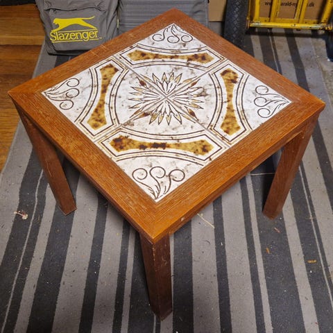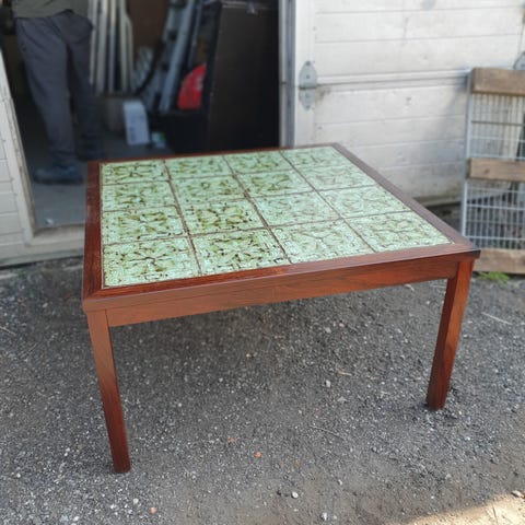 Fint retro kakkelbord med mørkegrønt bladmønster.