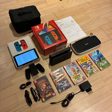 Nintendo Switch OLED konsol Pokémon Scarlet & Violet edition. Konsollen er en specialudgave med Pokémon Scarlet & Violet-tema, herunder dekoreret dock og Joy-Con controllere i rød og lilla med Pokémon-motiver. Systemet har OLED-skærm, aftagelige Joy-Con controllere og tilslutningsmulighed til tv via dock. Velegnet til både håndholdt spil og tv-spil med understøttelse af Nintendo Switch-spil.