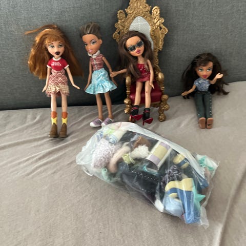 Bratz dukker og tilbehør sæt. Sættet indeholder flere Bratz dukker med forskelligt tøj samt tilbehør. På billederne ses blandt andet en seng med sengetøj, natdragt og maske til en af dukkerne, forskellige outfits, sko, tasker og en rød Bratz scene- eller studieenhed med mikrofon og detaljeret front. Egnet til leg med mode- og rollelege med Bratz figurer.