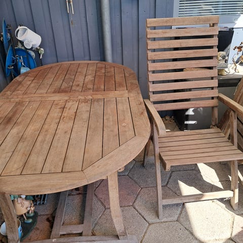 Brugt men fuldt funktionelt havebord, med 8 nyere stole.