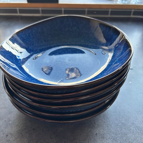 Sættet omfatter blandt andet 10 stk mørkeblå trekantet tallerken, 9 stk mørkeblåt krus med hank,