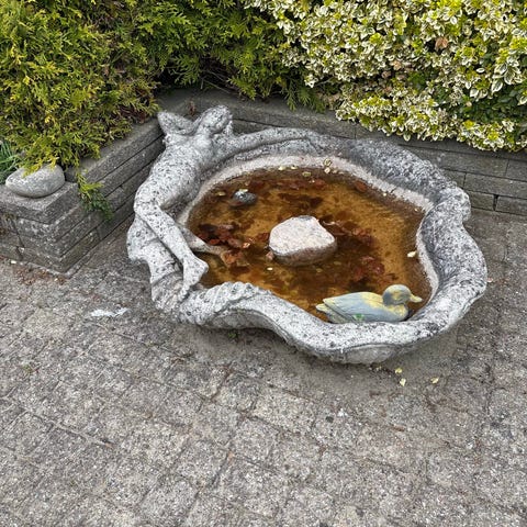Fuglebad i beton eller sandsten. Skålen står på en firkantet fod og har rund form.