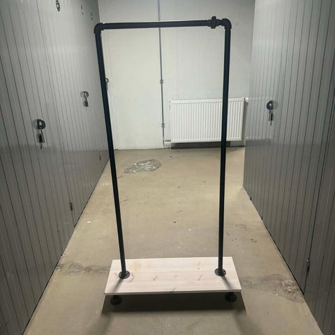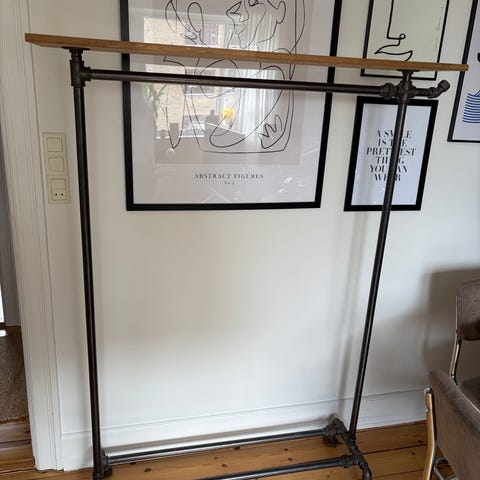 Cool garderobestativ fra Rack Buddy, lavet i vandrør, med træhylde, knage på siden og til sko nederst