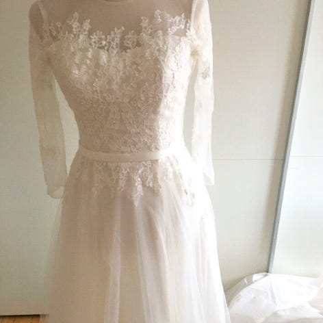 Kjolen har dansestrop, fuld længde og ¾-lange blondeærmer. Satinknapper langs hele ryggen.
