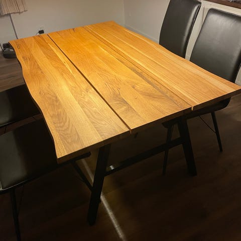 Planke spisebord af mørk olieret egetræsplanker med sorte ben af metal (målene: L140 x B80 x H75)