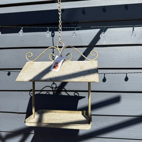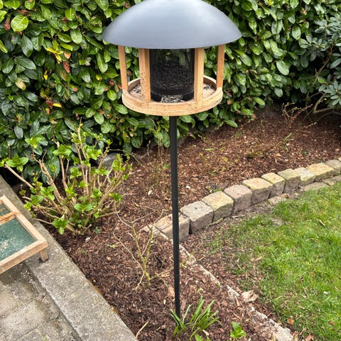 Fuglefoderstation på stander i sort metal. Foderstationen har øverste del med gitter og tag, som beskytter foderet, samt en rund bakke i perforeret metal til foder eller vand. Monteret på lodret stang, der kan placeres i fx krukke eller jord i haven eller på altan/terrasse. Velegnet til fodring af havens småfugle med frø, nødder eller mejsekugler.