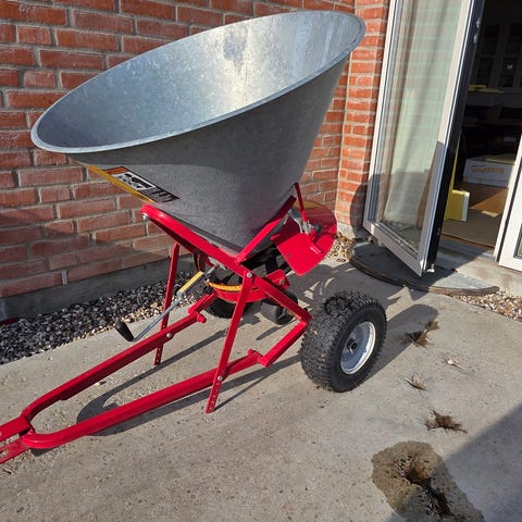 Gødningsspreder/såmaskine til montering efter mindre traktor, havetraktor eller ATV og er udstyret med tre hjul for stabil kørsel. Stor tragt/beholder til gødning eller lignende materiale, som fordeles via sprederenhed under tragten. Velegnet til spredning på marker, større græsarealer eller lignende udearealer.