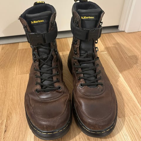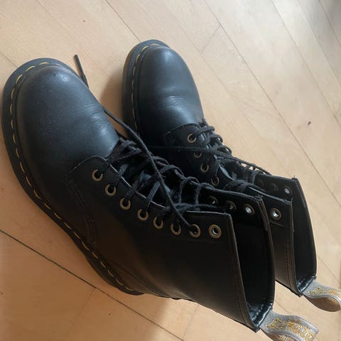 Dr. Martens støvler i sort læder i størrelse 43. Klassiske snørestøvler med gul syning langs sålen og hælstrop med logo.