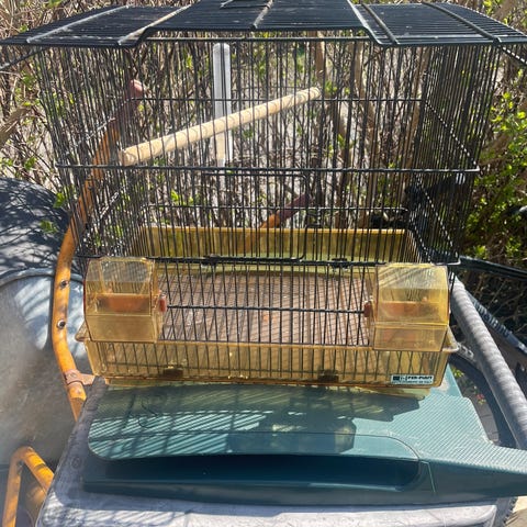 Fuglebur i metal med grå bund og gitter. Buret har buet top og lodrette samt vandrette tremmer. Der medfølger plastbakke i bunden samt plastfoderskåle på siderne. Egnede mål kan aflæses på billederne med tommestok, som viser længde og højde på buret. Velegnet til mindre fuglearter, hvor der er behov for et bur i mellemstørrelse med aftagelig bund for nemmere rengøring.
