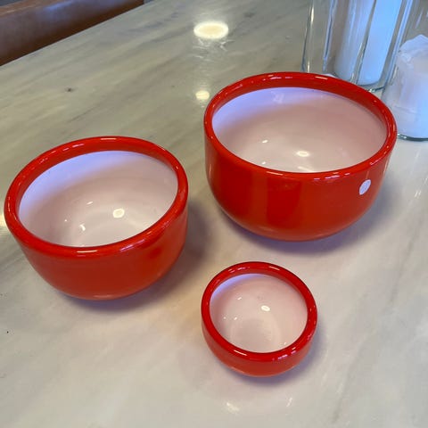 Tre farvestrålende serveringsskåle eller portionsskåle lavet af udhulet træ og malet i klare lakfarver indvendigt i farverne rød, orange og gul.