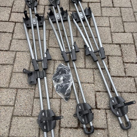 Thule cykelholder til montering på tagbøjler. Cykelholderen er i sølvfarvet metal med sorte plastbeslag. Den har hjulholder med rem og justerbar arm til fastgørelse af cykelrammen. Velegnet til transport af cykel på bilens tag, forudsat at bilen er udstyret med kompatible tagbøjler.