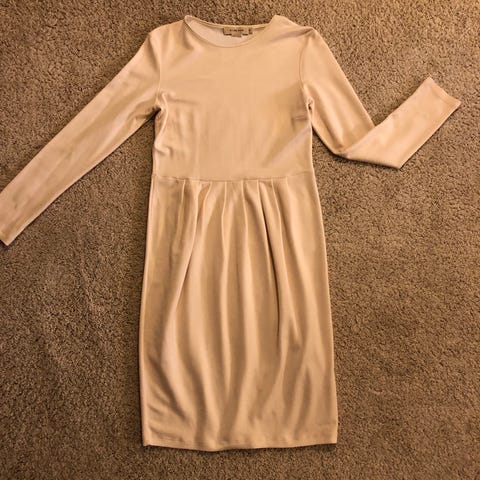 Elise Gug hverdagskjole i grå i størrelse 40. Kjolen har et enkelt, lige snit med lille slids foran og 3/4-lange ærmer med let vidde forneden. Materialet er en strukturvævet bomuldsblanding, der giver et let og behageligt fald. Velegnet som hverdagskjole eller enkel kjole til mere formelle sammenhænge.