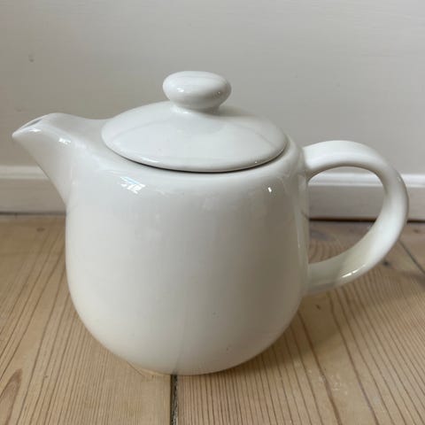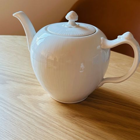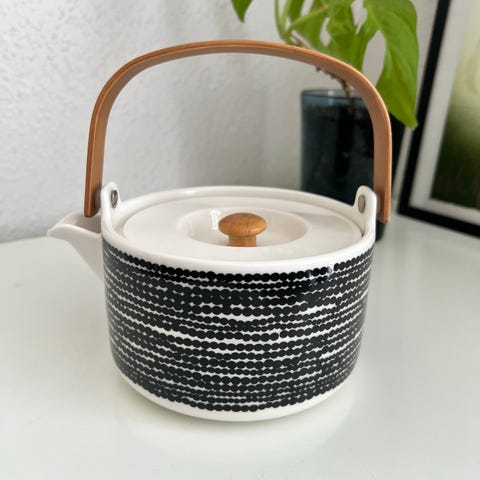 Marimekko tekande med si i hvid stentøj og låg i hvid stentøj med træknap Kanden har en buet hank i lyst træ. Hanken er lidt frønnet i den ene side.