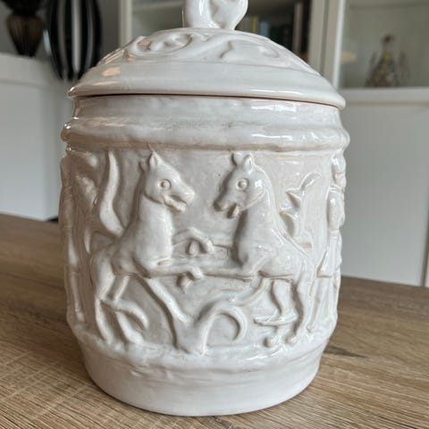 Krukken kan anvendes til opbevaring i køkkenet eller som dekorativ genstand i hjemmet. Fremstillet i glaseret porcelæn med aftageligt låg.