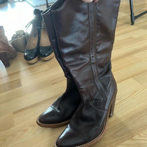 Sælger et par flotte knæhøje støvler fra Bianco i brun læder. Klassisk og tidløst design med hæl og lynlås på indersiden – perfekte til både hverdag og pænere brug.
