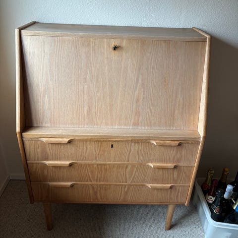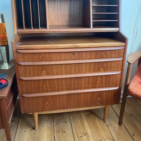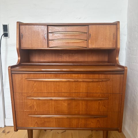 Fint teak chatol med skriveudtræk og spejl. 3 skuffe og 2 små skuffer. Fremstår med tydelige brugssporg