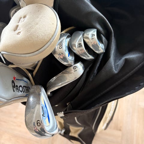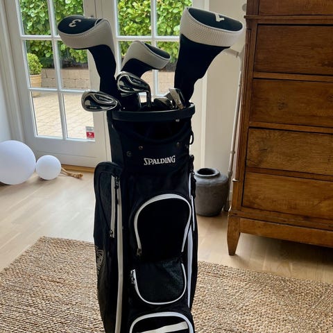 Panther by Beast golfsæt med bag i rød og sort. Sættet omfatter golfbag med stativ og flere opbevaringslommer samt et udvalg af jern og køller. Køllerne har Panther by Beast hoveder med tilhørende headcovers til blandt andet 1-, 3- og 21-køller. Skaftene er røde. Egnet til golfspillere, der ønsker et komplet sæt med matchende bag og køller.