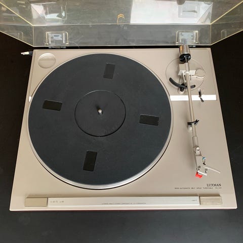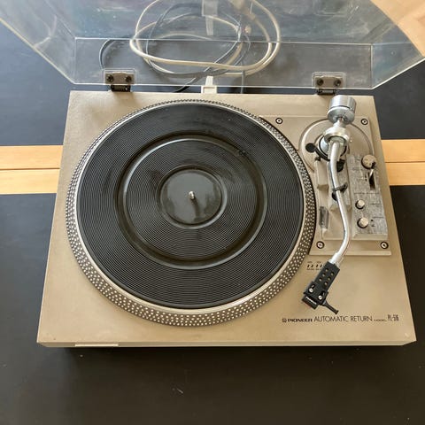 Sony PS-LX1 pladespiller i sølvfarvet kabinet med gennemsigtigt støvlåg. Pladespilleren har lidt ridser på låget, men spiller helt fint. Jeg har loddet nye rca stik på. Nypris i 1987 1395kr :-)