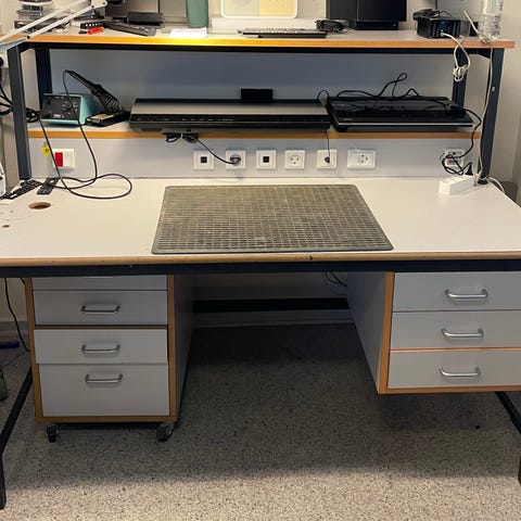 Meget godt hæve sænke bord se mål på fotos slidt har stået på et kontor på et værksted men fungerer perfekt