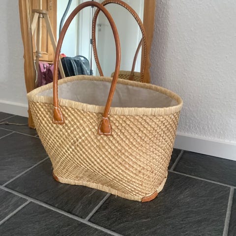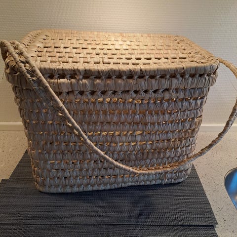 Håndlavet fletkurv i grøn og mørkebrun med to hanke. Kurven er flettet i et stribet mønster og har en oval form