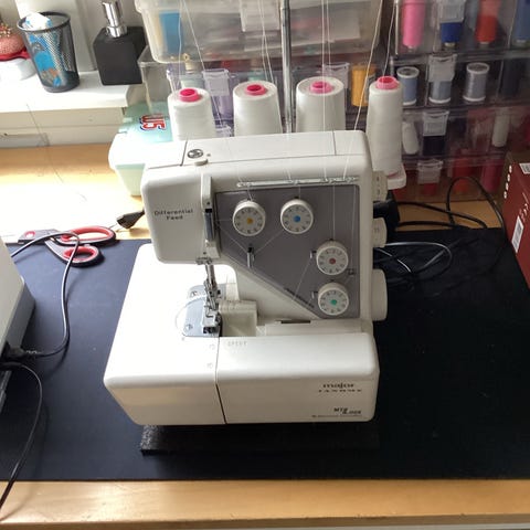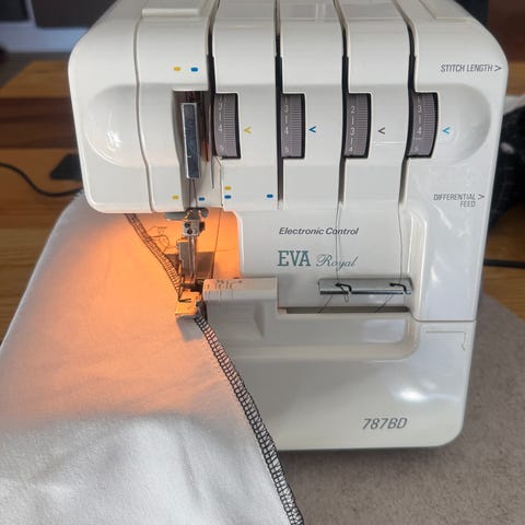 EVA Royal 1234DF overlocker i hvid. Den har farvekodede trådspændinger til flere tråde og sømtyper. Den er udstyret med elektronisk fodpedal til hastighedskontrol. Den er god til overlock-syning af kanter, oplægninger og sammensyning af forskellige stoftyper derhjemme eller til hobbybrug. Reservedele mangler, men de kan købes på nettet. Det er muligt, at maskinen skal serviceres.