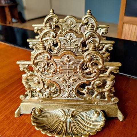 &Tradition dekorativ bogæske med stander i sølvfarvet metal-look. Æsken har detaljeret, ornamenteret overflade og er indvendigt foret med mørkerød tekstil. Den åbnes som en bog og kan bruges til opbevaring af fx en mindre bog eller andre genstande. Medfølgende stander er ligeledes rigt dekoreret og er designet til at holde æsken oprejst som et dekorativt element i indretningen.
